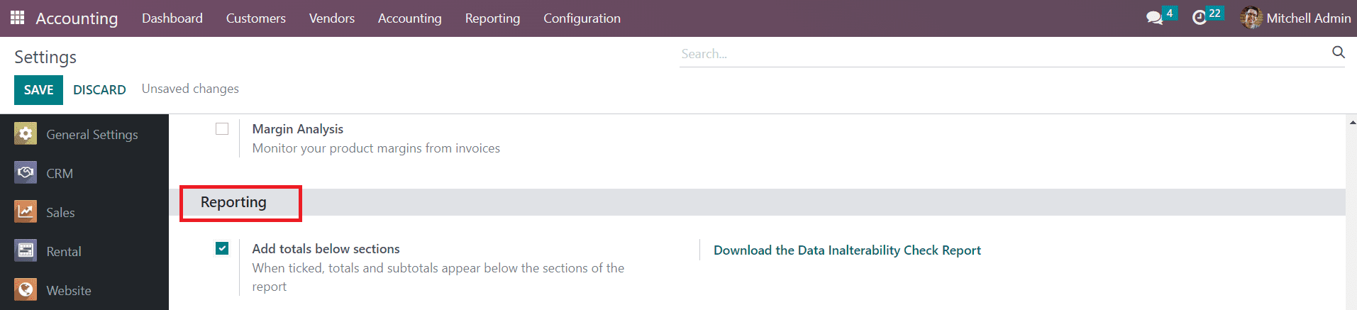 In the Settings menu of the Accounting module, you can find the Reporting tab from where you can activate the feature called Add Totals Below Sections.