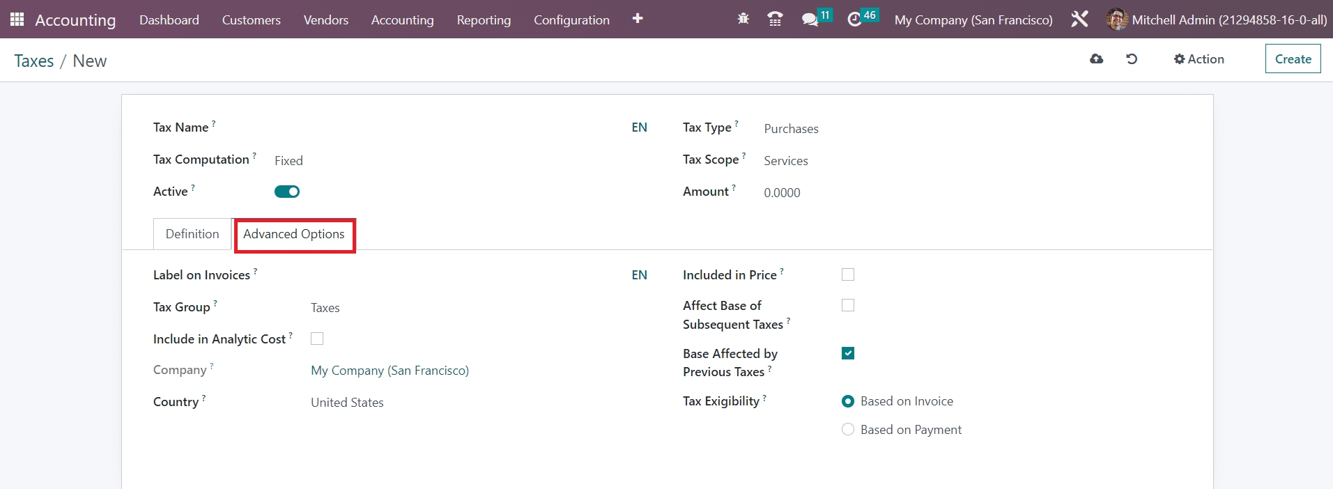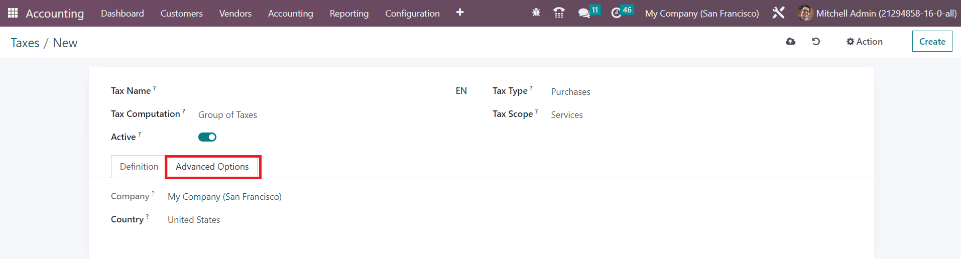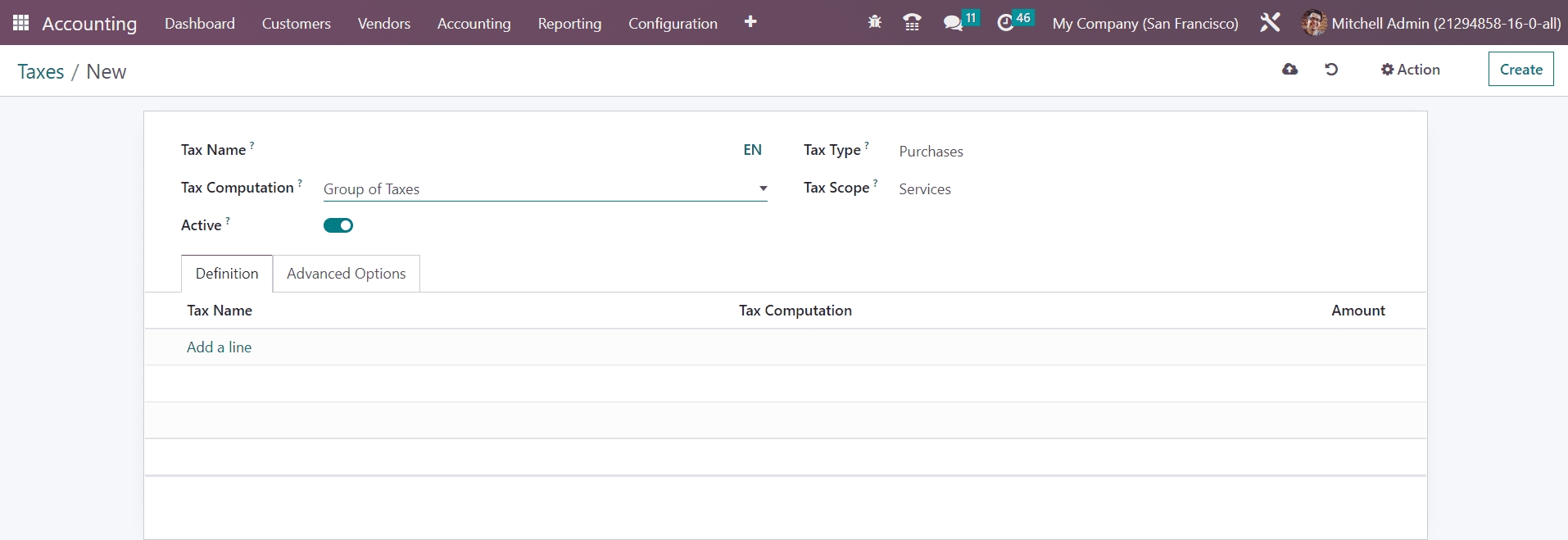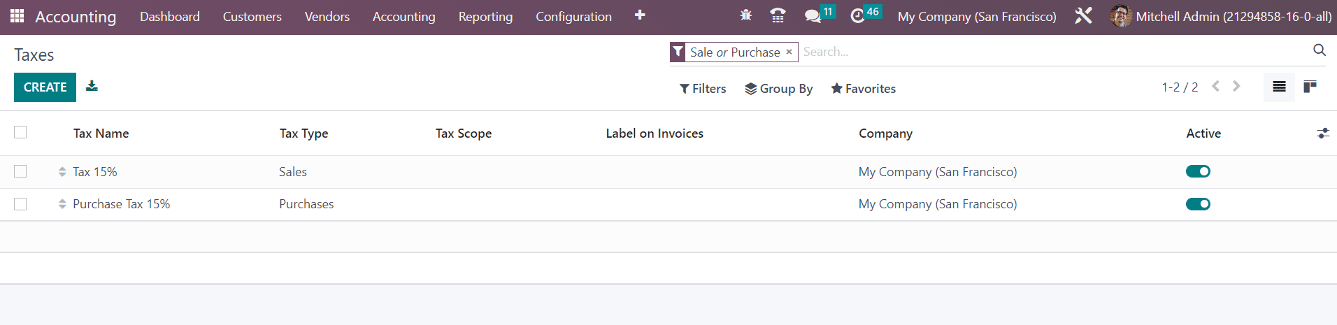 The available list of taxes can be filtered on the basis of Sales, Purchases, Services, Goods, Active, and Inactive. You can group them based on Company, Tax Type, and Tax Scope. The user will get customizable options in the Filters and Group By options. Now, click on the Create button to configure a new tax.