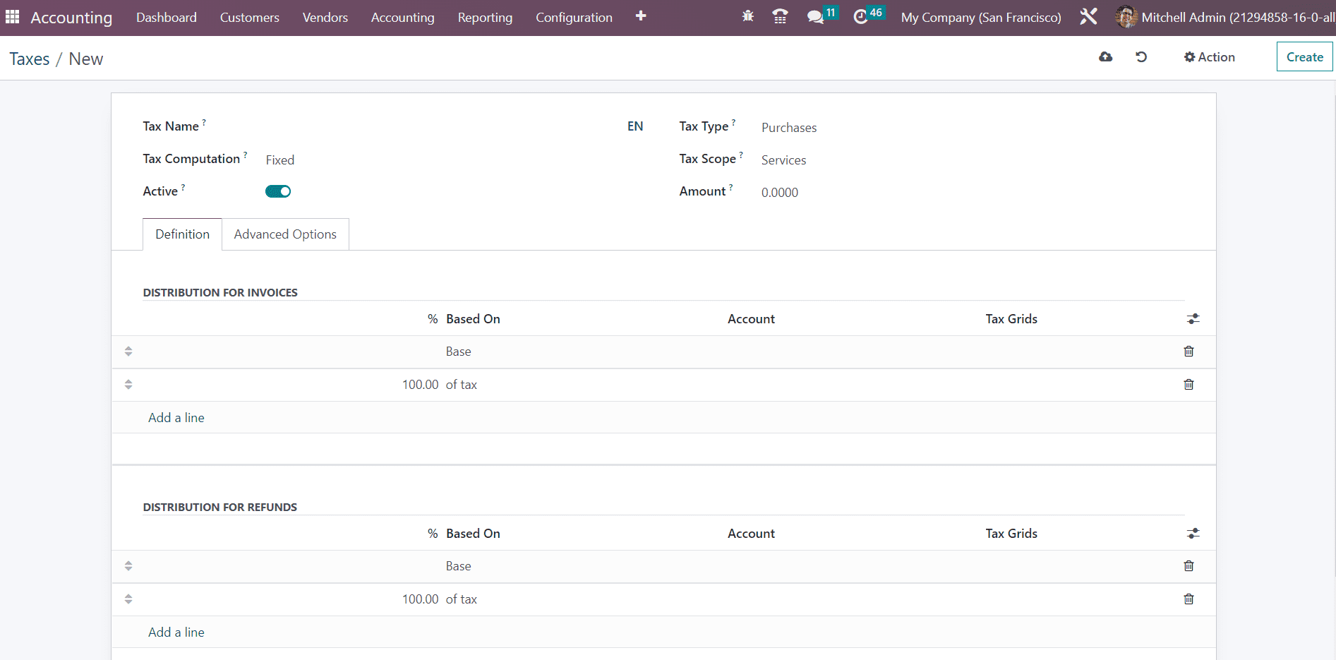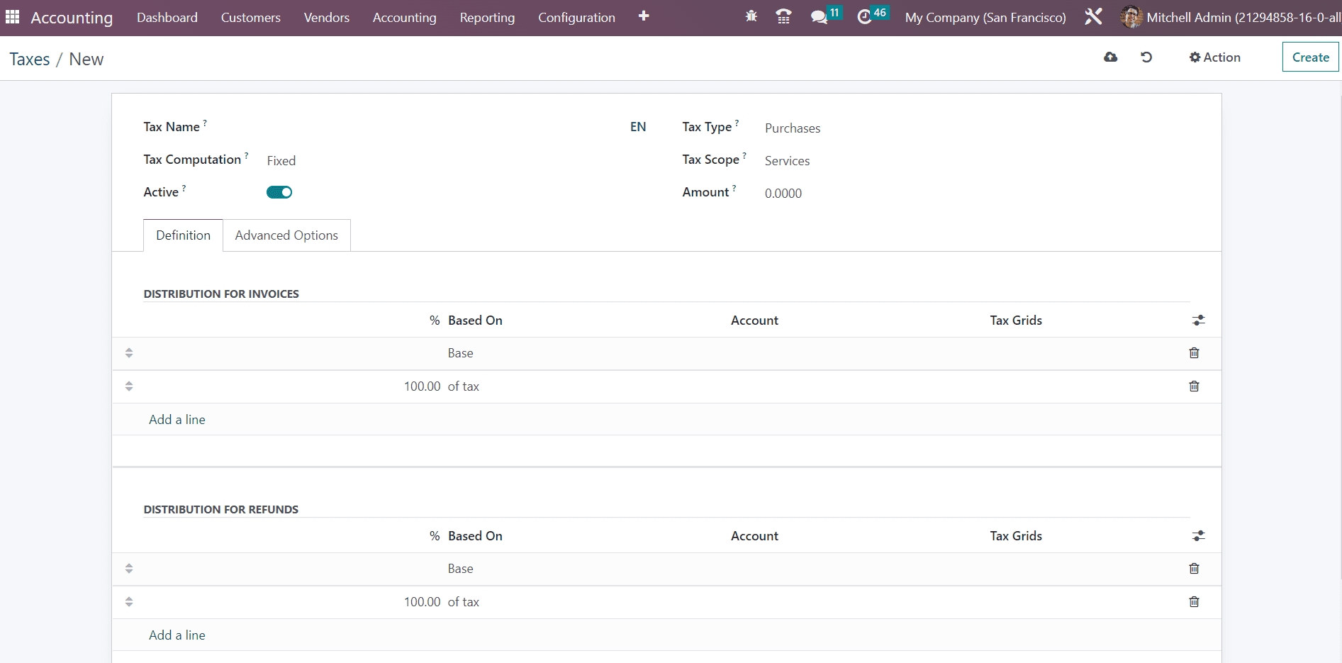 Under the Definition tab, you can define the distribution for invoices and refunds separately by mentioning the base on which the factor will be applied, account on which to post the tax amount, and tax grids using the Add a Line button.