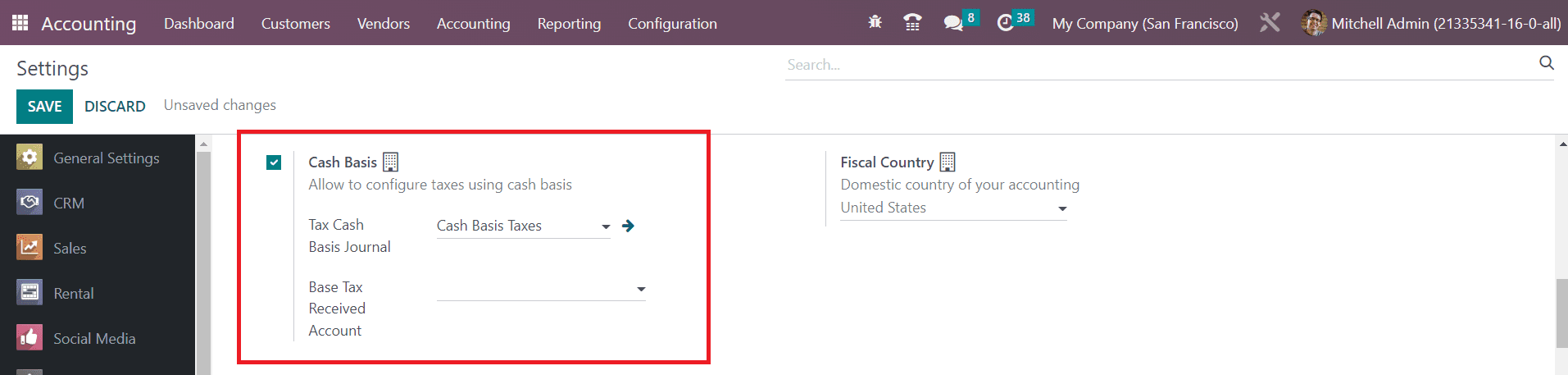 The Cash Basis feature can be activated to allow the configuration of taxes using cash basis. You can activate this feature if the taxes should use cash basis, which will create an entry for such taxes on a given account during reconciliation.