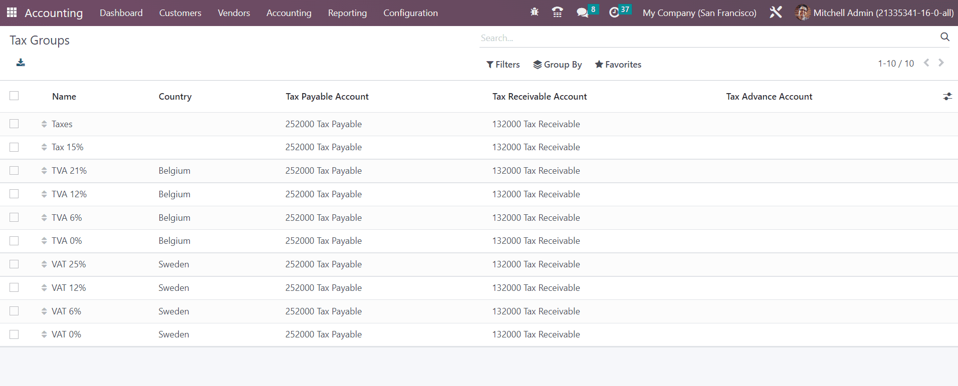 Based on your company operations, you can use these taxes on products, services, vendors, companies, and accounts. You can observe the available list of Tax Groups in Odoo from the Configuration menu of the Accounting module as shown below.
