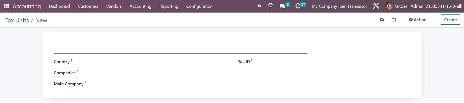 Tax Unit is used to group tax report declaration which is available under the Configuration menu of the Accounting module. The new Tax Units configuration window will be displayed as shown below.