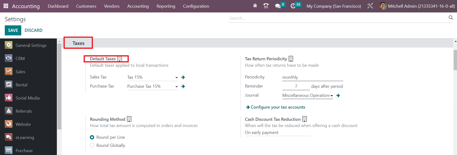 As shown in the image above, you can set Default Taxes for sales and purchases from the Settings menu of the Accounting module. Using the internal link available in the default taxes field, you can make adjustments to the sales and purchase taxes. The Tax Return Periodicity field defines how often tax returns have to be made. Here, you can mention the Periodicity, Reminder, and Journal to record the tax returns in the respective fields.