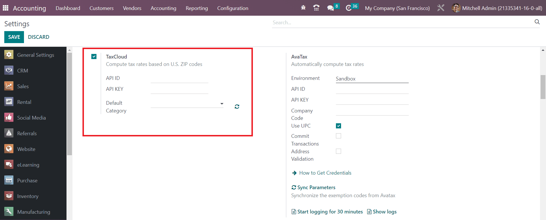 By activating the TaxCloud feature from the Settings menu of the Accounting module, Odoo helps you to calculate the tax rates based on U.S. Zip codes. In the available fields, you can specify the API ID, API KEY, and Default Category.