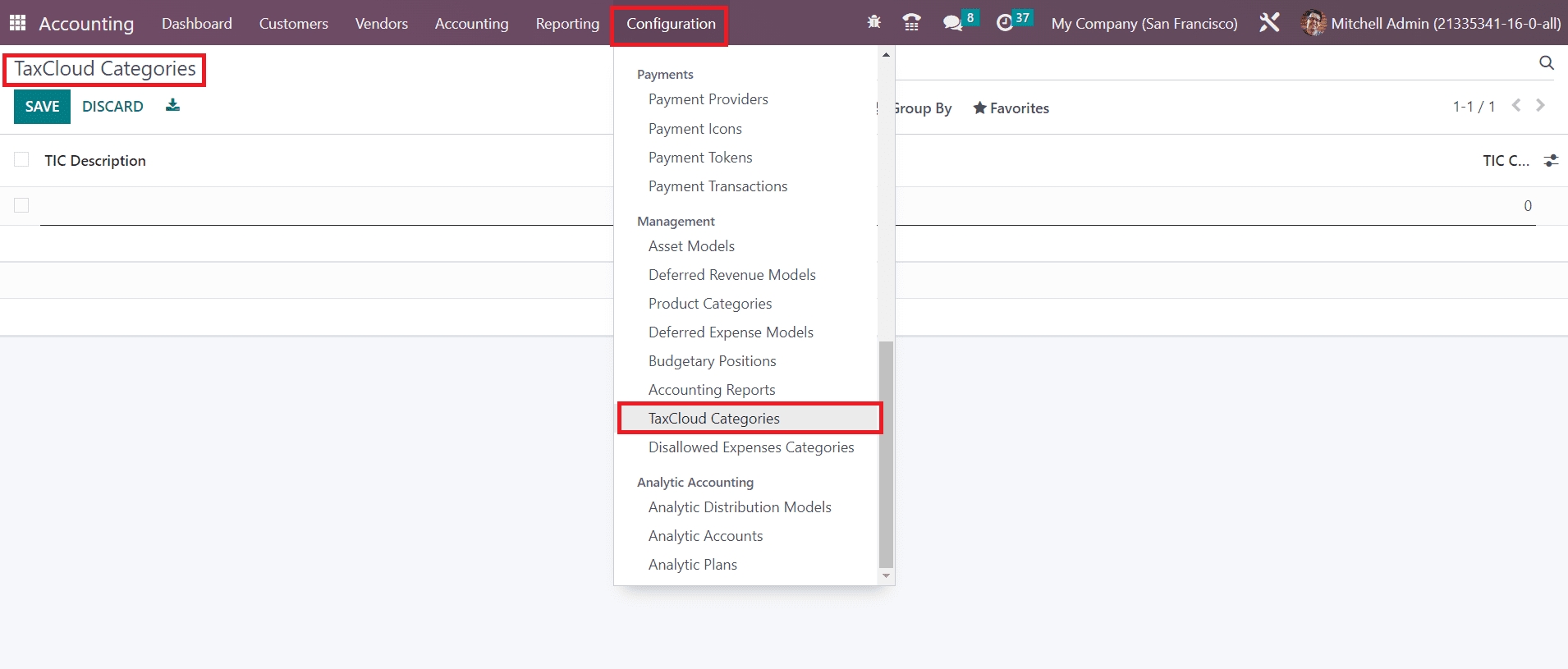Under the Management tab in the Configuration menu, you can find the TaxCloud Categories. Here, you can create a new category by mentioning the TIC Description and TIC Code.