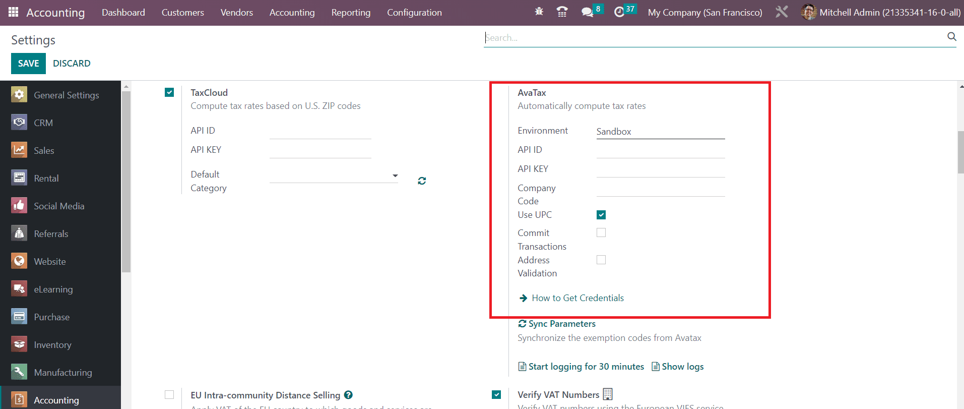 Avatax is a tax calculation provider that automatically computes the tax rates. In the respective fields, mention the Environment, API ID, API KEY, and Company Code. Activate the Use UPC, Commit Transactions, and Address Validation if necessary. After providing adequate information, you can specify avatax categories on products and products categories while configuring them. It helps to automatically compute the taxes on orders and invoices.