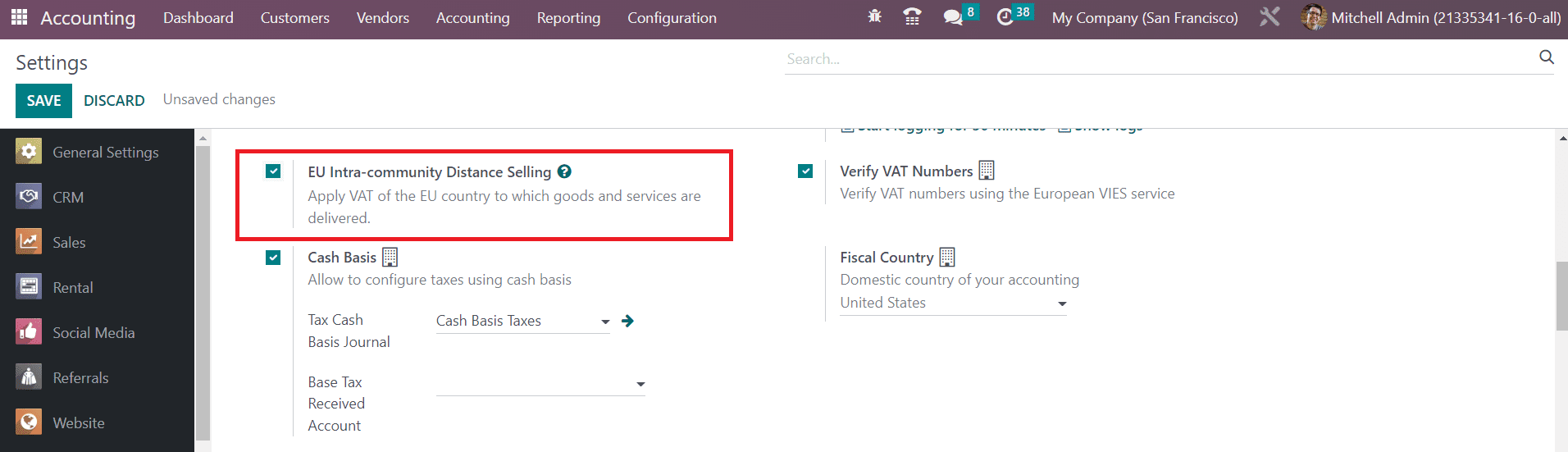 If you sell goods and services to customers in a foreign EU country, you must charge VAT based on the delivery address. For this, you can activate the EU Intra-community Distance Selling feature from the Settings menu of the Accounting module as shown below. This rule applies regardless of where you are located.