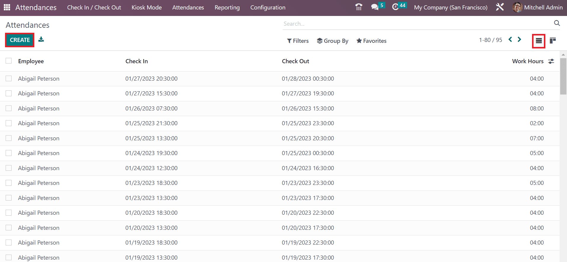 We can manage each employee's attendance in a firm using the Odoo 16 Attendance module. All pre-figured list of attendance is viewable by selecting the Attendances menu. In the List view, you can obtain the attendance data such as Employee, Work Hours, Check In, and Check Out. To define a new employee's attendance, press the CREATE icon in the Attendances window.