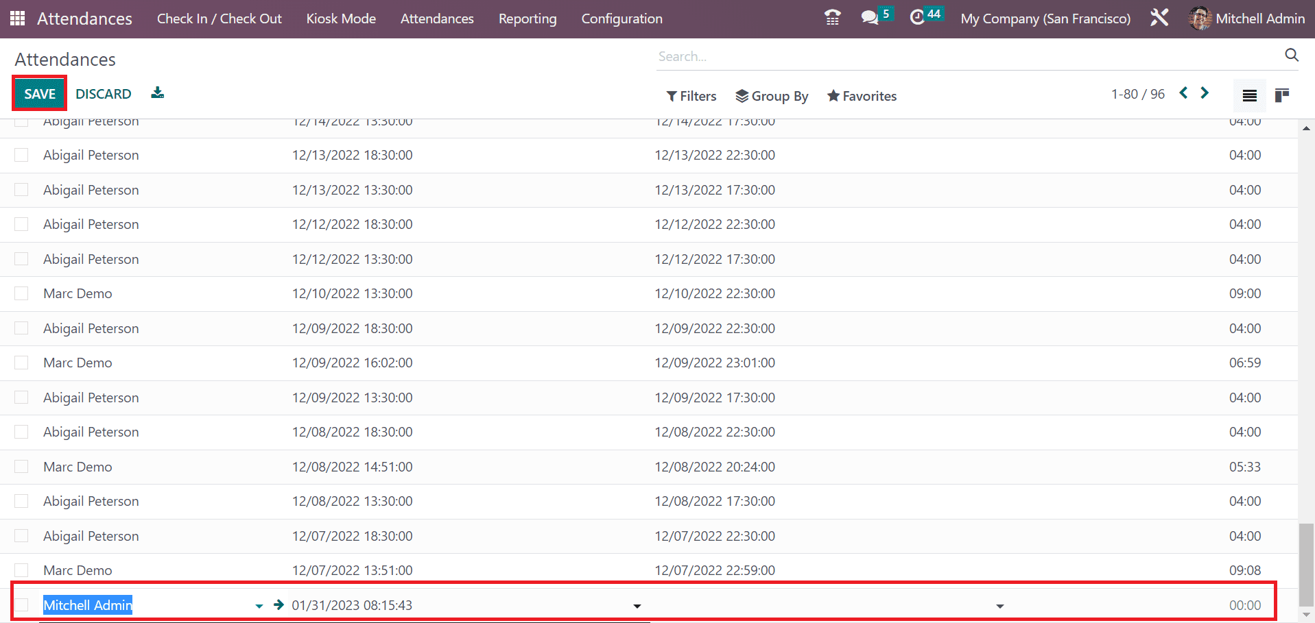 A new space opens at the end of the Attendances page once clicking on the CREATE icon. You can choose the employee name and select the time in that space. Once applying the details, click the SAVE icon in the Attendances window.