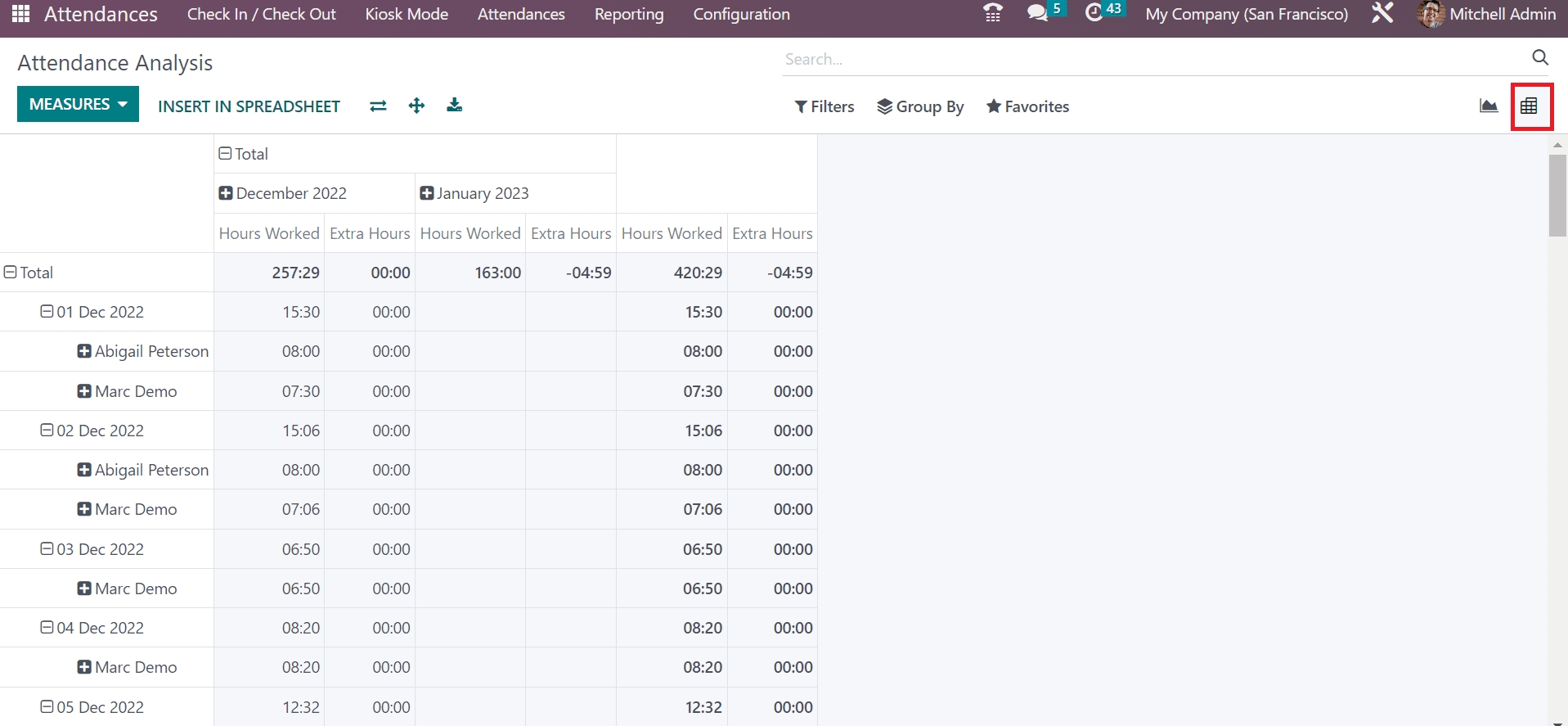 In the Pivot view, the user can see the pivot table that defines the total working hours of each employee separately. Based on each month, the user can identify the real working time of a worker in the company.
