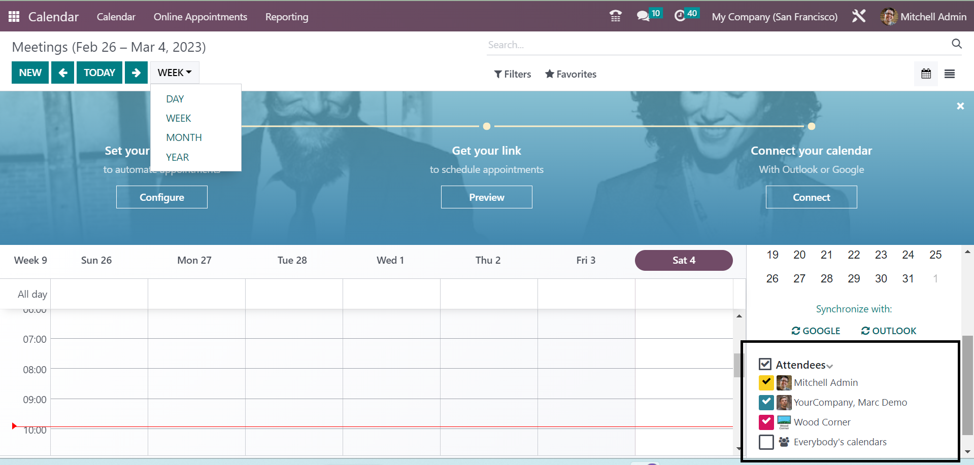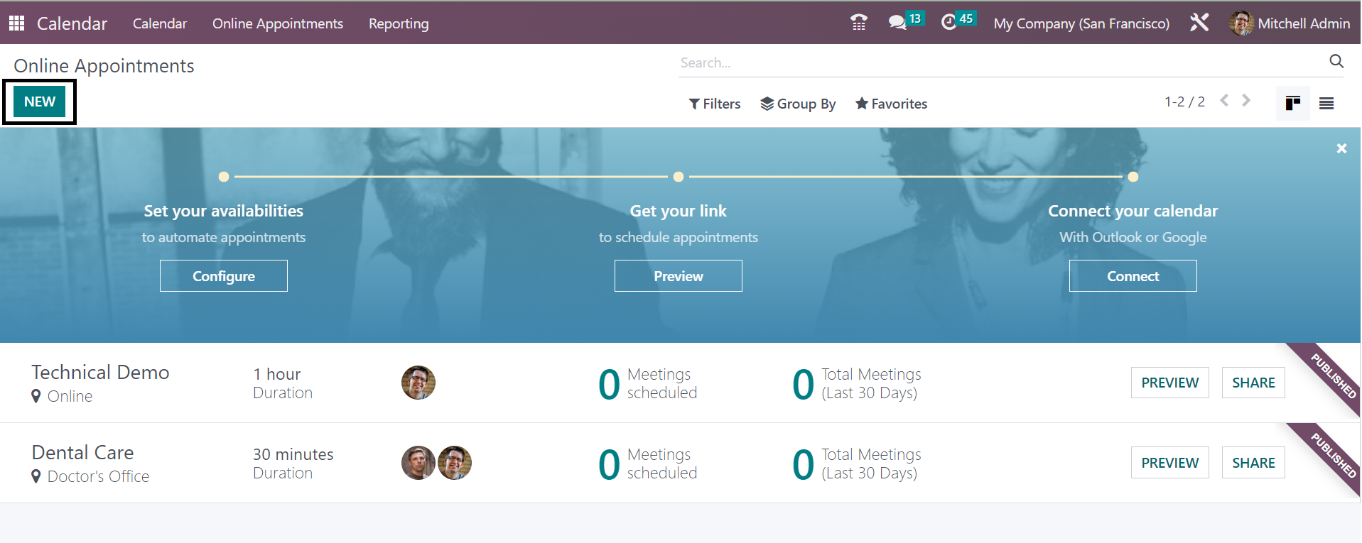 On looking at the presence of the employees and clients in the company, you can easily arrange for online appointments under the Calendar module in the Odoo ERP. When you are done with the installation of the Appointment module in the Odoo, which is available in the app store of the Odoo Software, you can easily regulate and manage the appointments. Their feature helps you in reducing the risks in the meetings with the employees and others. You will get the option on the main page of the Calendar module itself. The page provides certain information, as shown below.