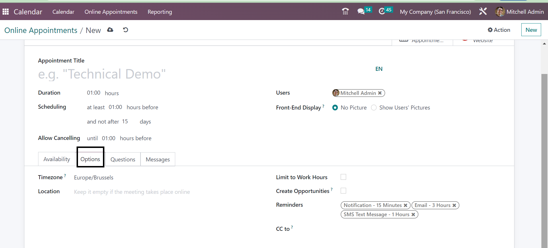 Under the Options Tab, you will get some options, such as Timezone, Location, Limit to work hours option to trigger, create opportunities option to trigger, as well as Reminders to add in the allotted spaces. You can also send the appointment to whom you had set on the CC to option.