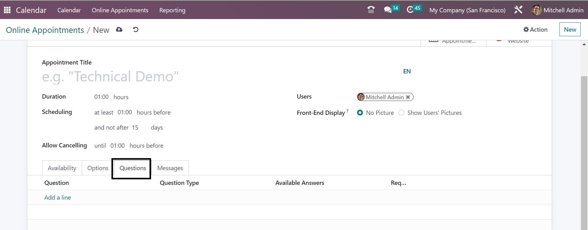 As shown in the above image, you will get the Questions Tab, which helps you to add the questions related to the appointment that you are going to have. In order to include the questions, you can go for the Add a Line option, which leads you to a new page, as shown below.