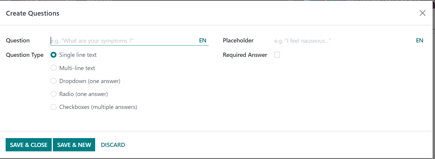 On the questions creation page, you can mention the questions in the provided space. The question type can be set as single line text, multi-line text, dropdown, radio, or checkboxes. You can provide the placeholder and trigger the required answer option if the answer to the question is necessary.