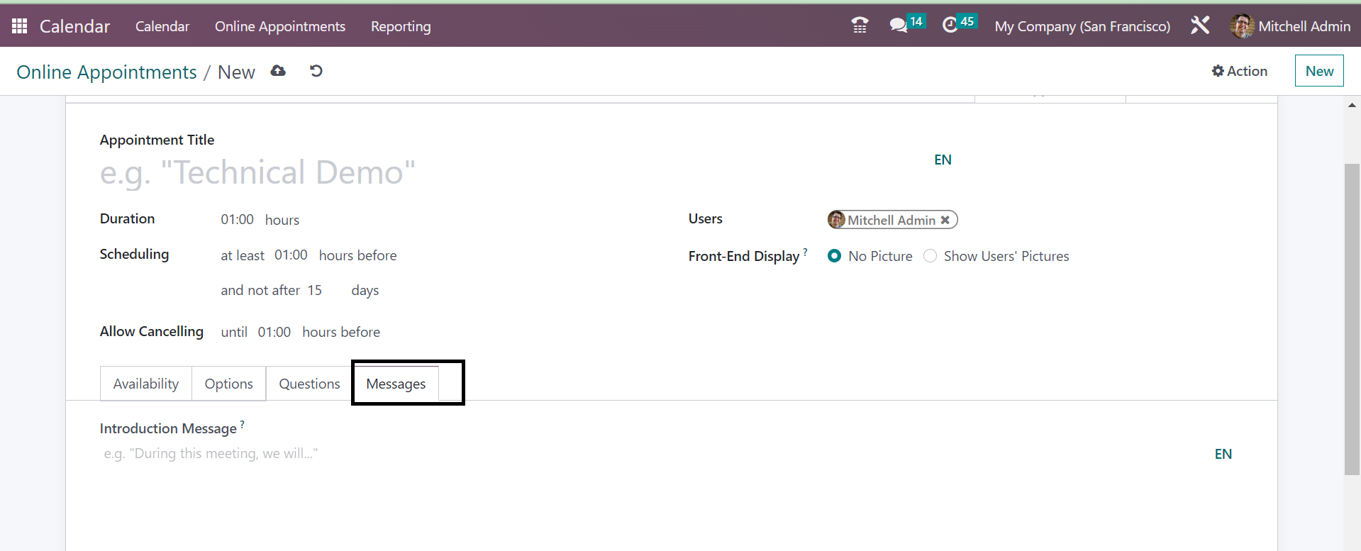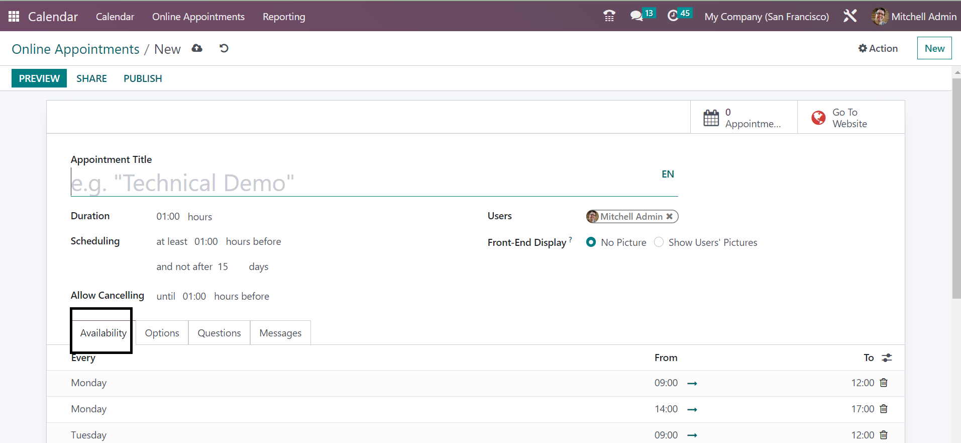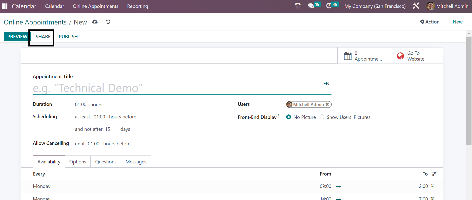 On the creation page, you will get some space for providing certain data regarding the creation of online appointments. You have to provide a name for the appointment under the Appointment Title option. The Duration of the meeting can be provided under the Duration option. You can arrange the scheduling of the meeting according to the time taken for the appointment in the allotted space. You can also make use of the allow canceling option in order to cancel the appointment in the provided time period. The users can be given, and the Front end display can be set as no picture or show users pictures.