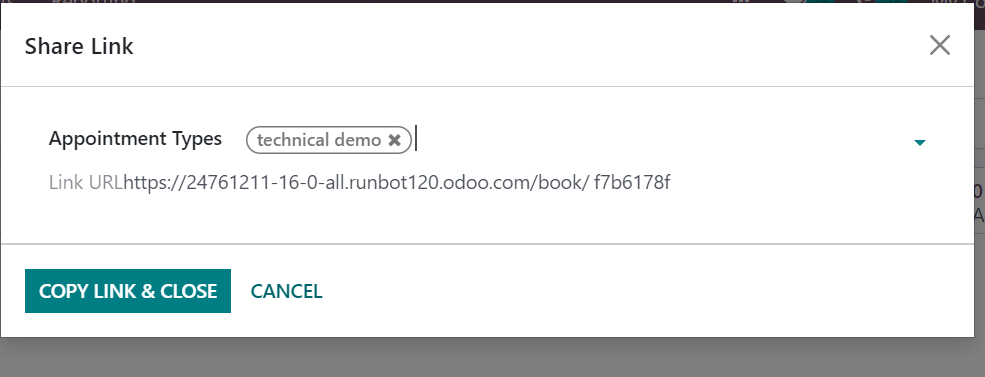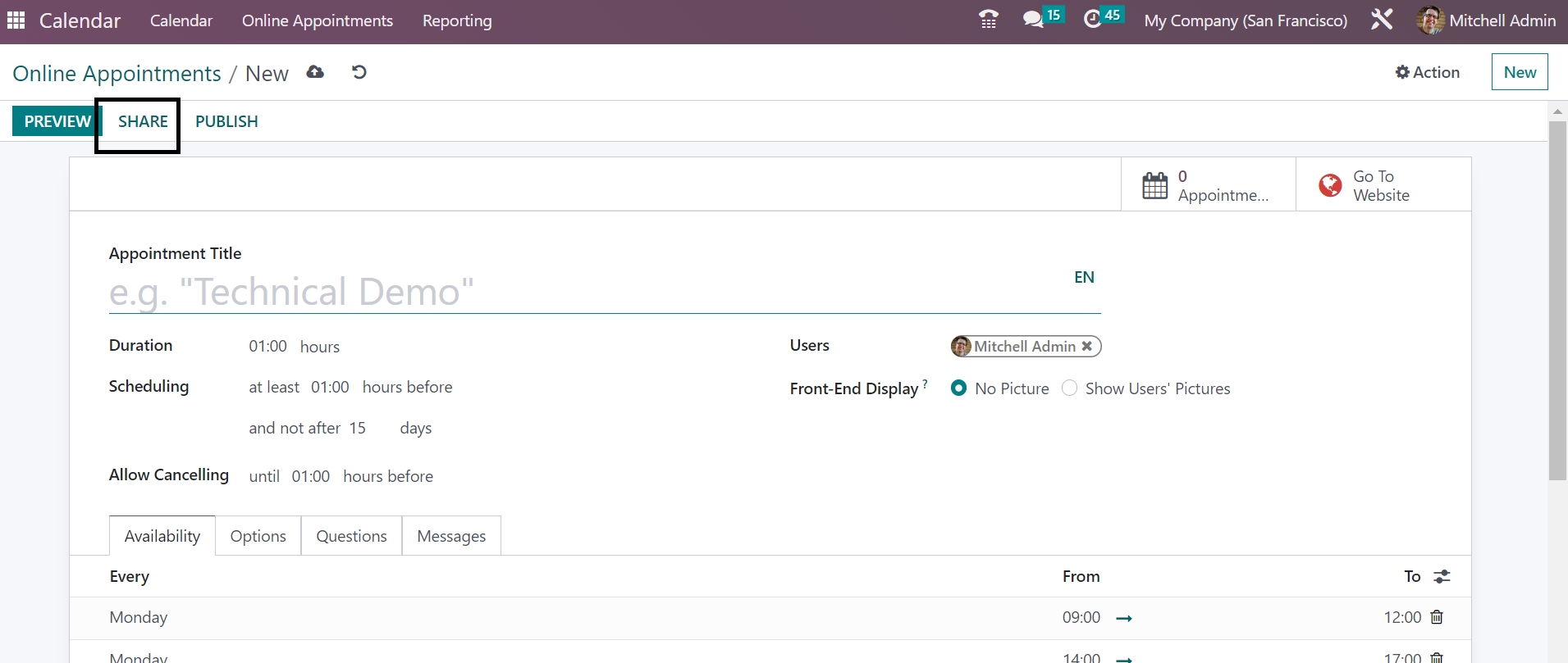 The share option helps you to share the link of the online appointment that you have created with the others in the company.