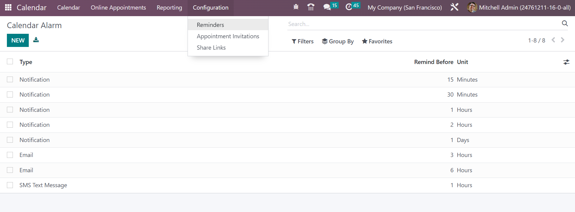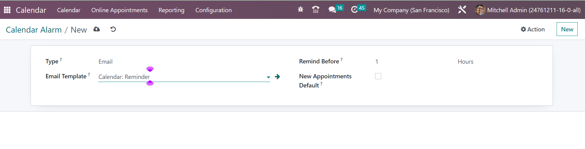 This option under the Calendar module helps you in reminding of the appointments that are going to get commenced. Reminders can be made more than one that assists the employees in order to avoid forgetting of a particular appointment. As shown in the above screenshot, you will get the calendar alarms from the reminders option in the configuration menu. On the page, you have all the created alarms on particular appointments. The page includes the information, such as type, reminder before, and unit options. In order to make a similar kind of reminder or alarm to the appointment, you can just go to the Create icon provided on the leftmost side of the page.
