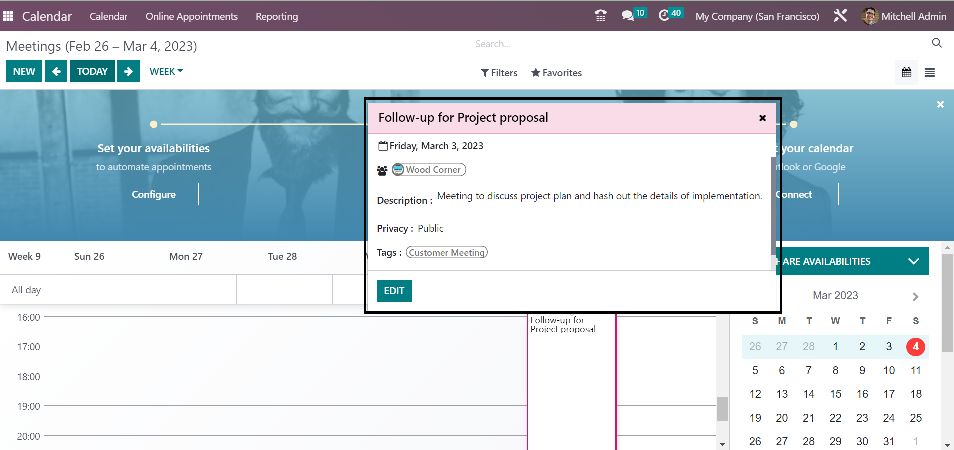It is essential to make certain meetings and decisions in order to enhance the relationship between the employees and the staff working in the company. Well-structured planning and scheduling of activity is essential for such kinds of meetings. And such meetings help you in making the meeting well conducted in a company for the success of the company. There is the Calendar module in the Odoo Software, which helps you to make well-structured kinds of meetings that are internal as well as external. The process can be done within single steps.
