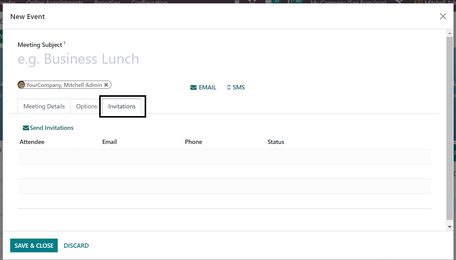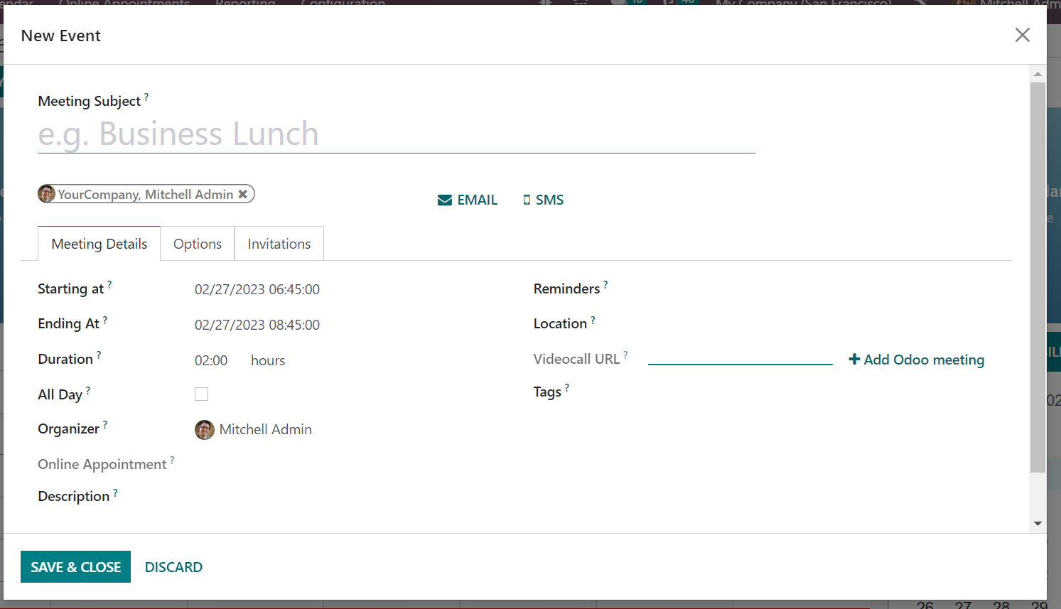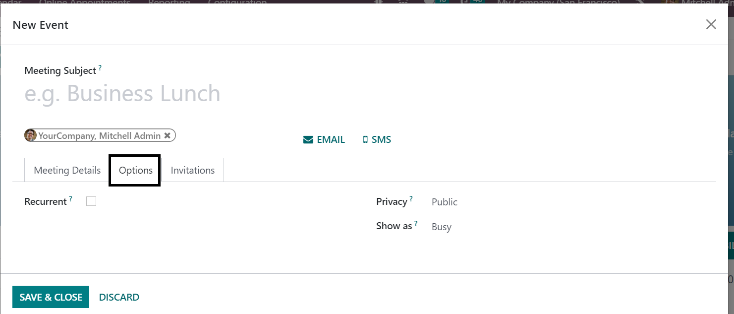 On providing the subject of the meeting, you have the Meeting details and Options tab to provide some data. Under the Meeting Details option, you can provide the starting date and Ending date of the meeting in the provided space. The duration of the meeting can be provided in the given space. All Day option can be triggered if the meeting has to be scheduled for everyday. You can mention the organizer and provide a description of the meeting that you are going to schedule in the given spaces. The Email and SMS option helps you to send the notification on the meeting to those attendees who are going to be in this meeting. You can also keep reminders, provide the space for the meeting in the location option, video call URL, and can also add Odoo meetings as well. Related tags can be added on the provided space.