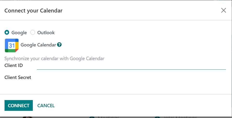 Here, you can mark it as google or outlook. The option helps you to synchronize the calendar with the google calendar. You can provide the client ID and client secret. Then, go to the connect option. So that, you will get connected with the google calendar.