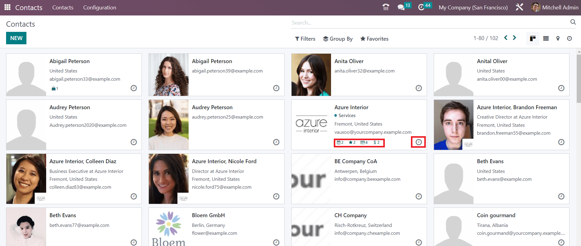 This is the Kanban view of the Contact dashboard. As you can see in the screenshot, you will get a preview of the contacts saved in your system. Along with the basic details of the contact, you will get to see the photo of the contact on each profile. On each tab, you can observe small icons which represent the number of opportunities, scheduled activities, sales orders, shopping carts, and purchases. Clicking on the small clock icon will let you schedule an activity with the respective contact.