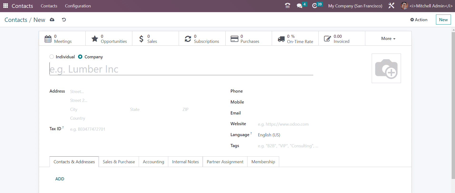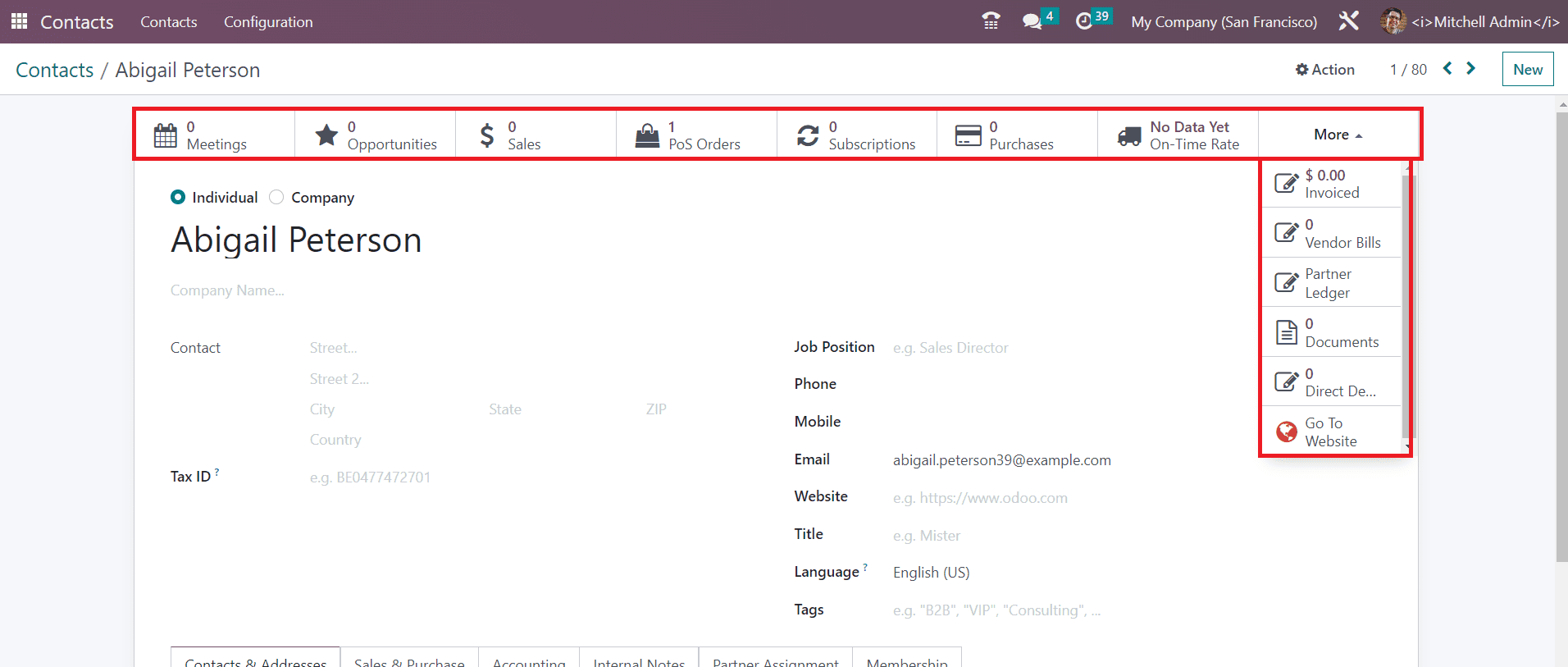 From the form view of the contact, you will get some smart buttons as highlighted in the screenshot above. These smart buttons can be used to view scheduled meetings, Opportunities, Sales, PoS Orders, Subscriptions, Purchases, delivery, Invoiced Amount, Vendor Bills, Partner Ledger, Documents, and Direct Debit Mandates. By following the details mentioned in this section, you can easily create a new contact in this module.