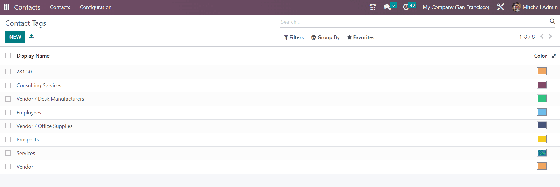 It is easy to configure tags for the contacts from the Configuration menu. You will get the Contact Tags option from the Configuration menu which will direct you to the window where you can observe the already configured tags for contacts. It will show the Display Name and Color.