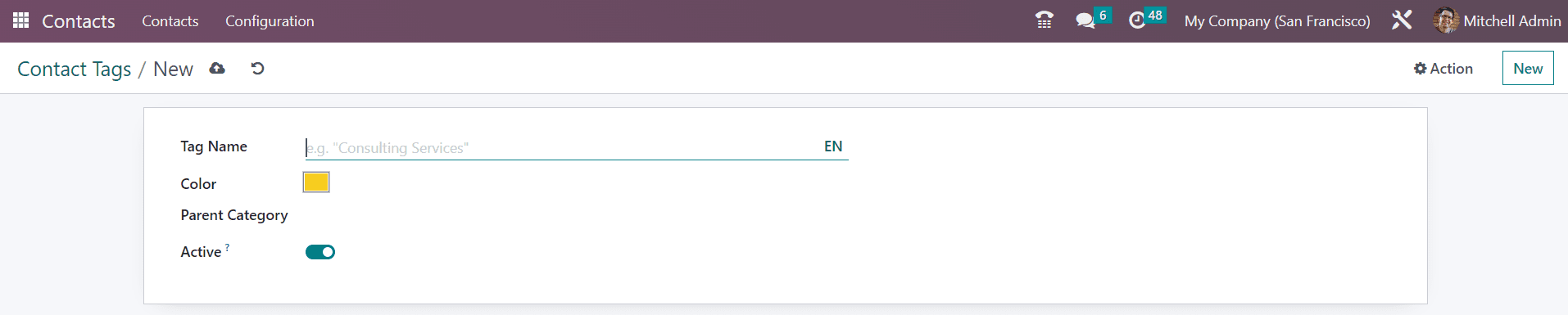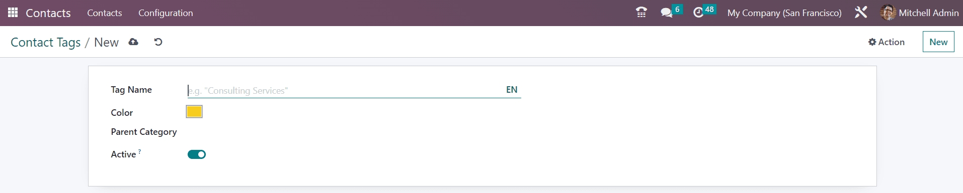 Set a color for the tag for easy identification and Parent Category in the respective fields. You can enable the Active field to enable the new tag.