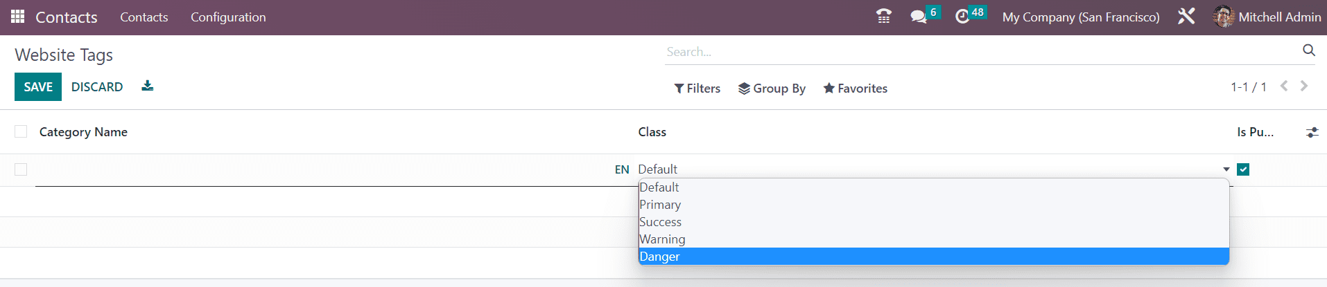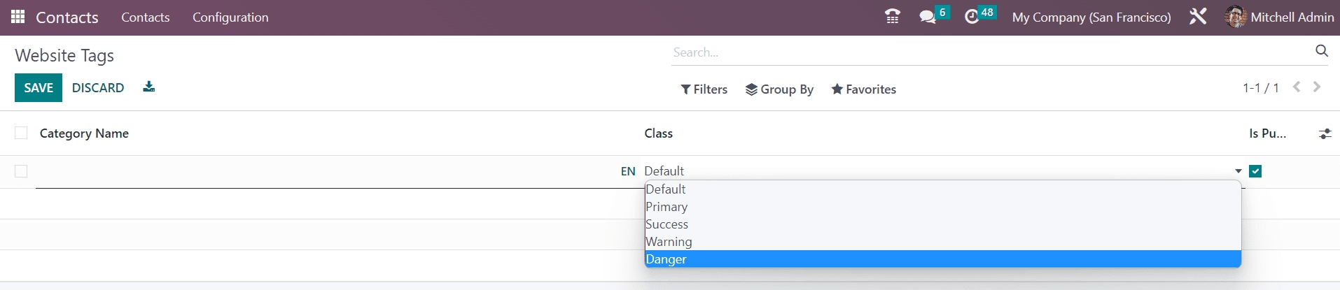 A new line will appear in the window where you can mention the Category Name. You can select the Class from the drop-down menu which shows the options Default, Primary, Success, Warning, and Danger. Select the appropriate class and click the Save button.