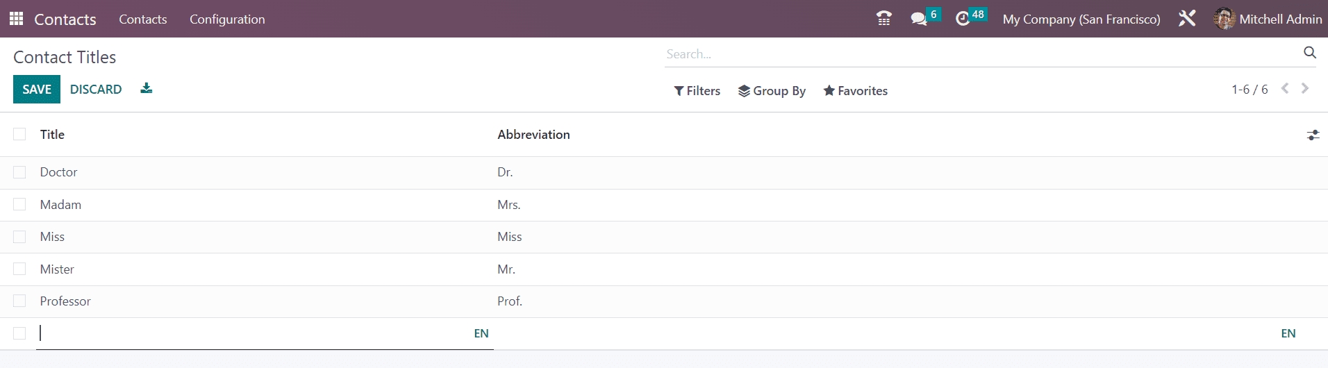 Clicking on the New button, you can create a new Contact Title. Mention the Abbreviation of the title in the given space and click on the Save button.