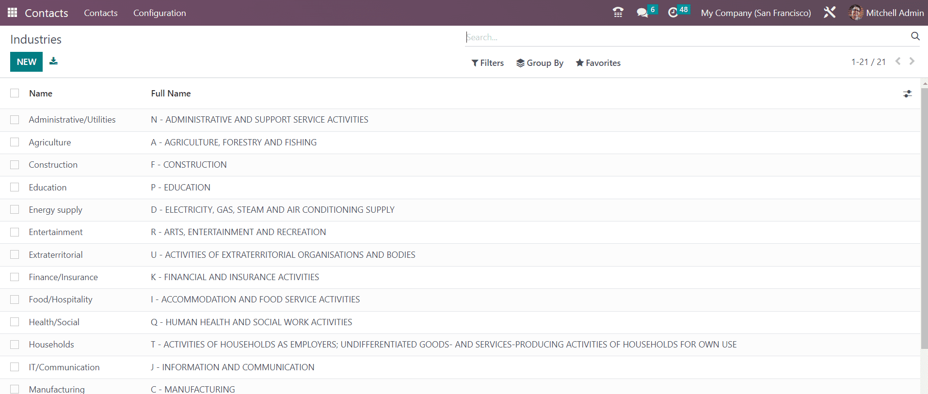 Sometimes you might be requested to mention industries while configuring a new contact in the Contact module. In such cases, you can configure Industries from the Configuration menu so that you can easily select them while creating new contacts. The list of pre-configured industries will be available in the window.