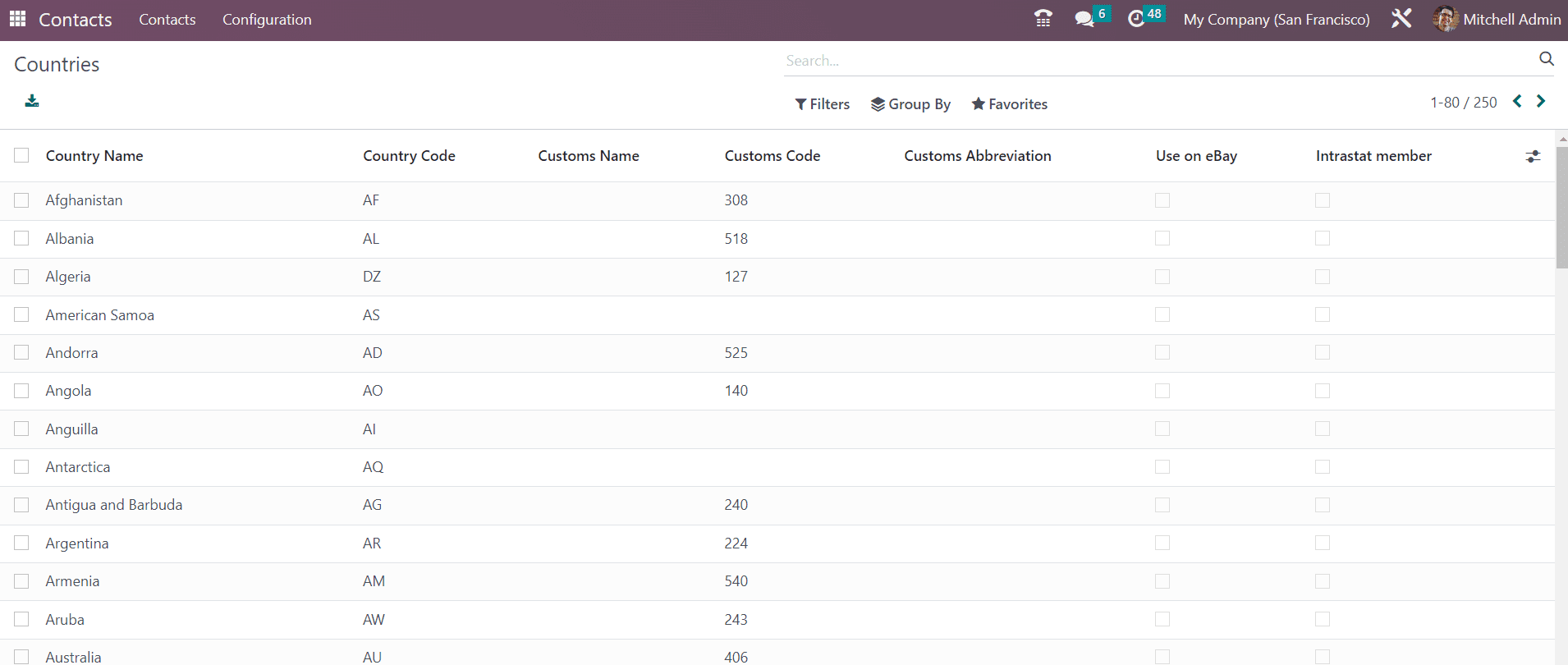 The list of Countries will show the Country Name, Country Code, Customs Name, Customs Code, Customs Abbreviations, Use on eBay, and Intrastat Member.
