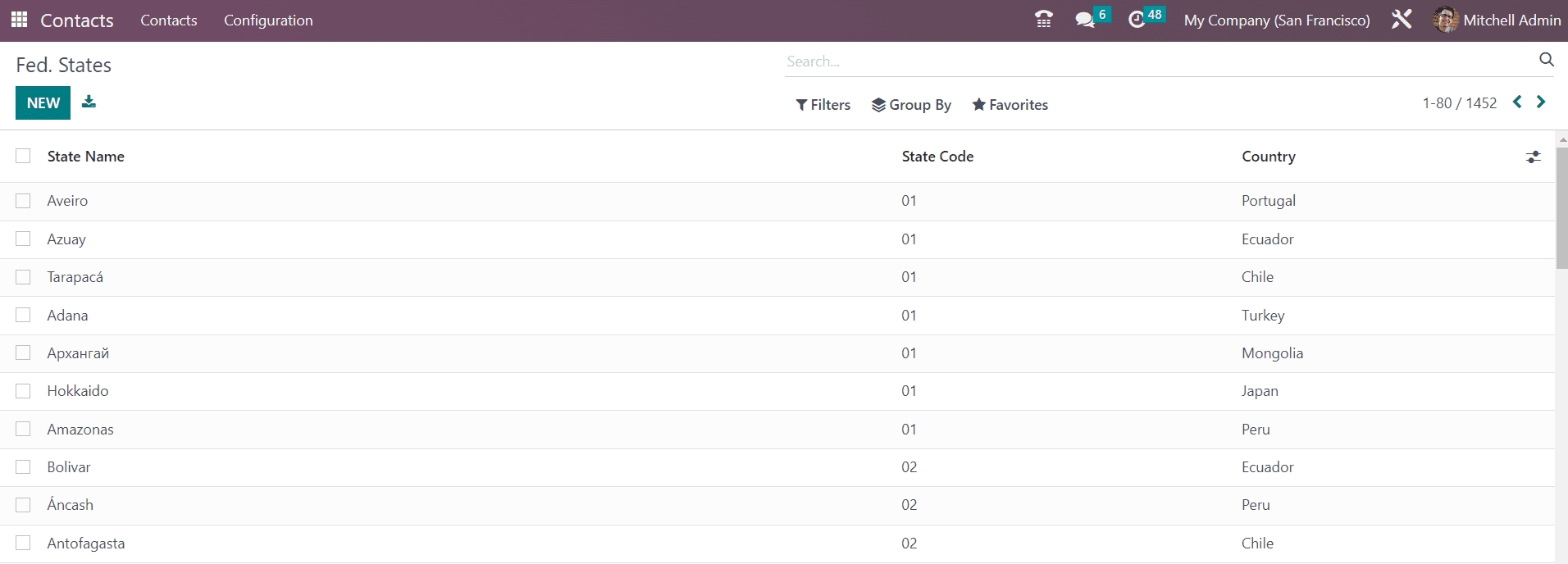 The Fed. States list displays the State Name, State Code, and Country. Using the New button, you can add a new state to this list.