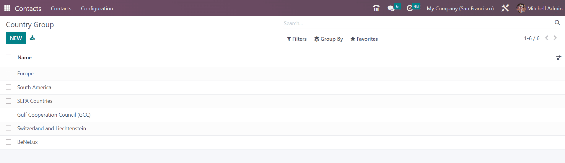 The name of the Country Groups will be available in the respective menu in the Contact module. Use the New button to add another country group to this list.
