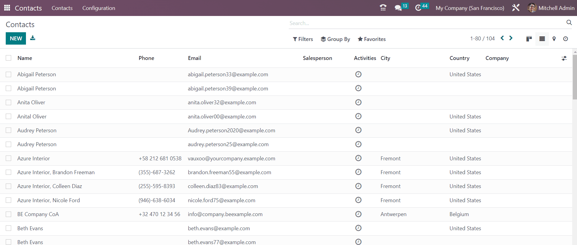 The list view of the contact dashboard shows the Name, Phone, Email, Salesperson, Activities, City, Country, and Company. In the Filters menu, you will get Individuals, Companies, Customer Invoices, Vendor Bills, Subcontractors, and Archived as filters. You can group the contacts based on Salesperson, Company, and Country using the Group By option. Now, click on the New button to add a new contact to the module.
