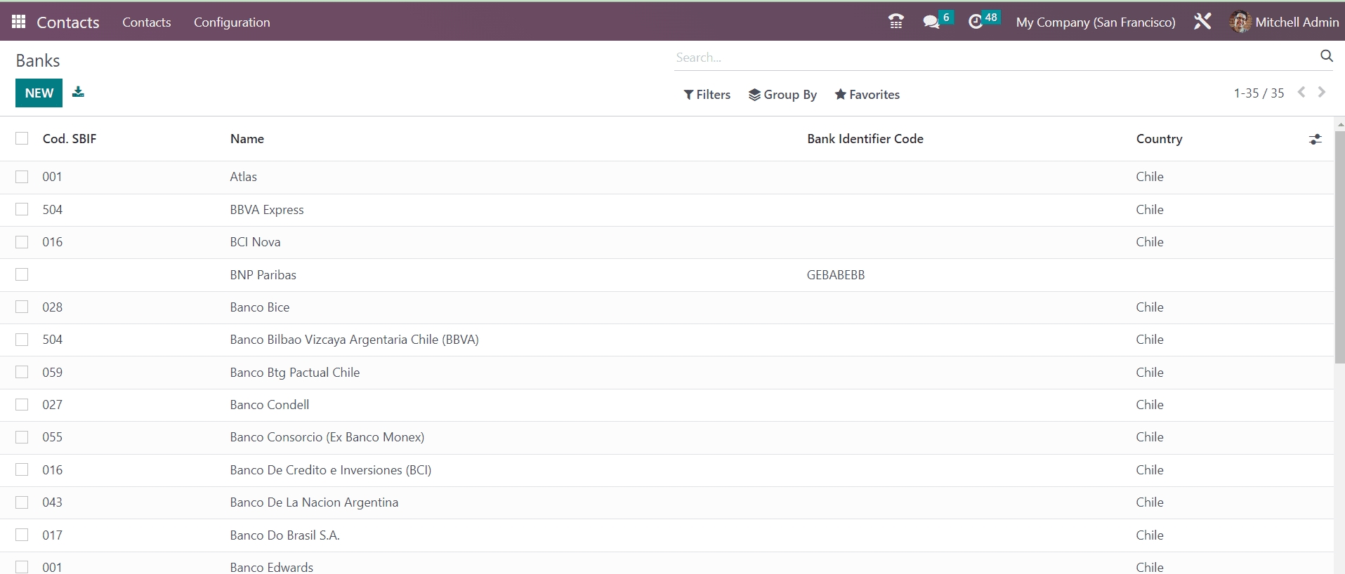 The list view includes the Cod. SBIF, Name, Bank Identifier Code, and Country. In order to create a new bank, you can click on the New button.