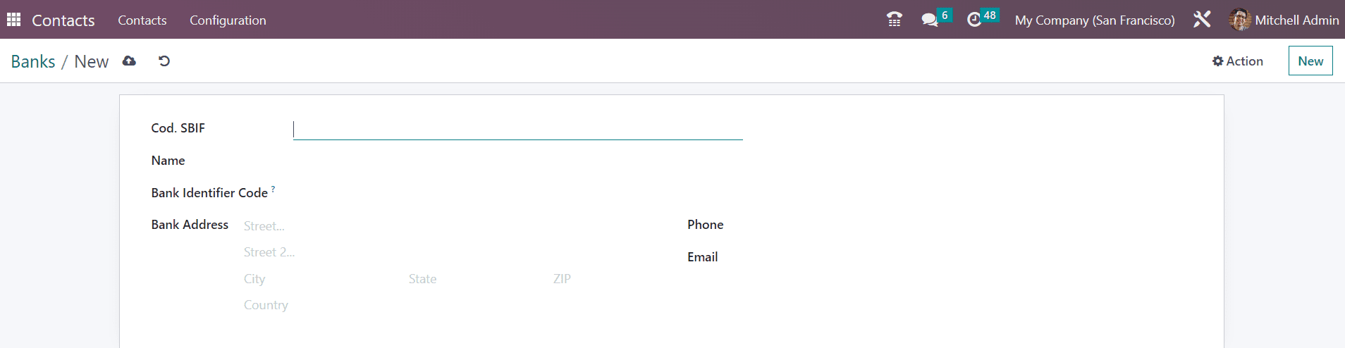 This will open a new form view where you can provide the Cod. SBIF, Name, Bank Identifier Code, Bank Address, Phone, and Email.