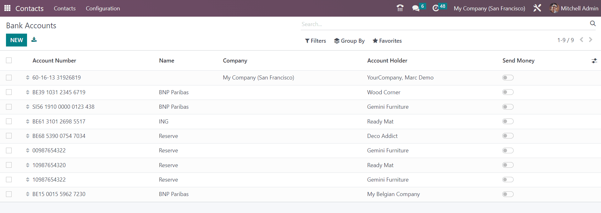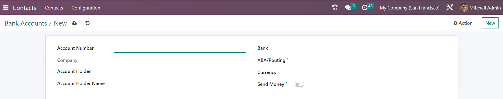 This is the list view of the Bank Accounts. You can view the Account Number, Name, Company, Account Holder, and Send Money status from this window. Clicking on the New button will lead you to a new form view to add another bank account for contacts.