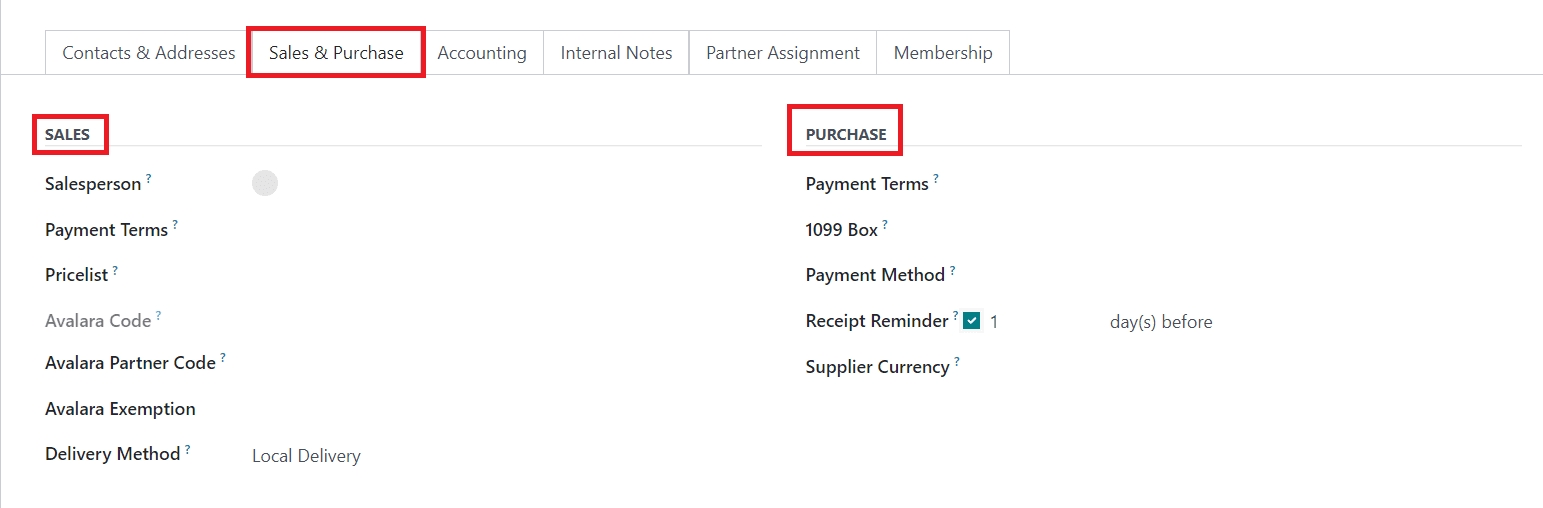 For managing sales operations related to the contact, you can assign a Salesperson in the Sales & Purchases tab. The Payment Terms you mention here will be used for sales orders and invoices of the contact instead of the default one. To process sales to the contact, you can specify a suitable Price List in the given field. The customer code set in Avalara for this partner can be mentioned in the Avalara Partner Code and Avalara Exemption. The code available in the Avalara Code can be used for cross-reference in the Avalara portal. The delivery method used for the sales orders of this contact can be specified in the Delivery Method field. Under the Purchase section, you can add the Payment Terms used for the purchases and vendor bills, 1099 Box (Journal items of this contact will be summed in the selected box of the 1099 report), preferred Payment Method for paying this contact, and Supplier Currency in the respective fields. Activating the Receipt Reminder will automatically send a confirmation email to the contact before the expected receipt date by asking the contact to confirm the exact date.