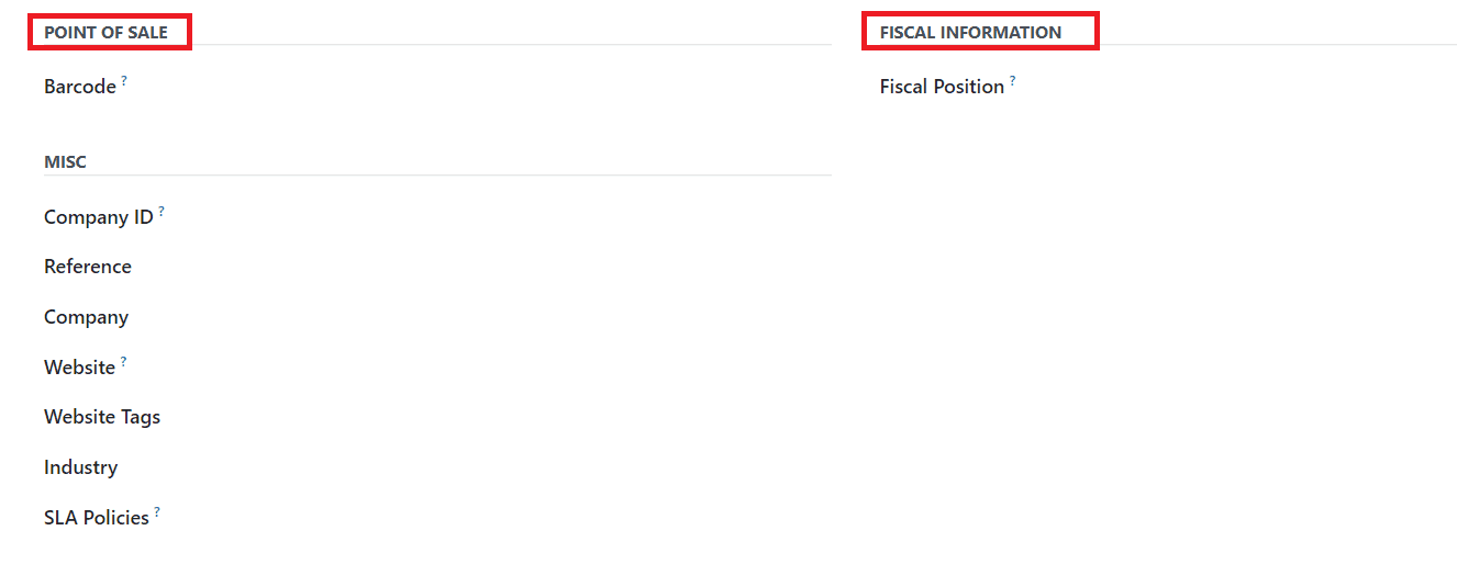 Under the Point of Sale section, you can set a Barcode to identify this contact. Set Fiscal Position in the Fiscal Information field. In the Miscellaneous section, you can provide the Company ID, Reference, Company, Website, Website Tags, Industry, and SLA Policies in the corresponding fields.