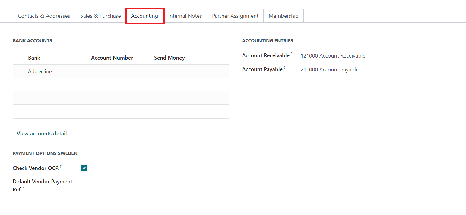 The details required for the accounting operations of the contact can be specified under the Accounting tab. Using the Add a Line button, you can mention the Bank and the Account Number. The payment receivable account and payment payable account can be mentioned in the Account Receivable and Account Payable fields, respectively. If this contact uses OCR numbers on their vendor bills, you can activate the Check Vendor OCR field. Along with this, you can set a Default Vendor Payment Reference for vendor bills.