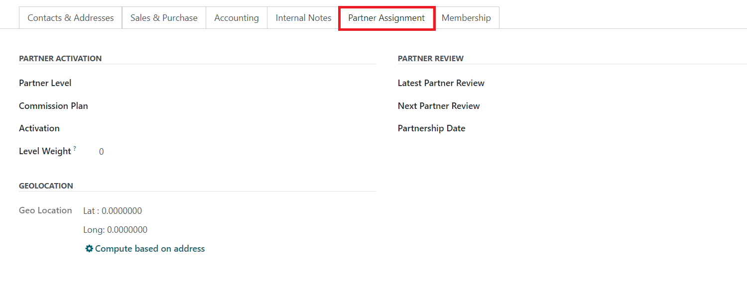 The Partner Activation and Partner Review details can be added under the Partner Assignment tab. Here, you can mention the Partner Level, Commission Plan, Activation, Level Weight, Latest Partner Review, Next Partner Review, and Partnership Date in the corresponding fields. Set the Geo Location of the contact in the given space.