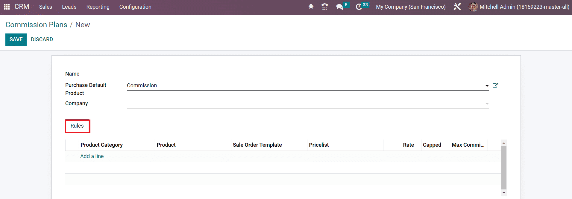You can mention the title of the commission plan in the Name field. If you want to give 10% of the invoiced amount as the commission for a partner, you can give the title of the commission plan as ‘Commission 10%’. The Purchase Default Product can be seen as Commission in the respective field. This is a service product that will be used to create a purchase order for the commission operations. By mentioning the purchase default product, a purchase order will be automatically created in the Purchase module. Mention the name of the company in the Company field. The rules of the commission plan can be added under the Rules tab. Using the Add a Line button, you can mention the Product Category, Product, Sales Order Number, Pricelist, Rate, Capped, and Maximum Commission. Click the Save button after adding all detail to the new commission plan.