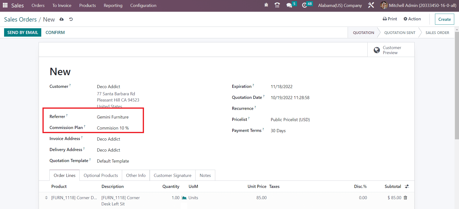 The Commission Plan will automatically appear in the respective field since we have already configured a particular commission plan for the partner. Now, you can Confirm the sales order and generate an invoice.