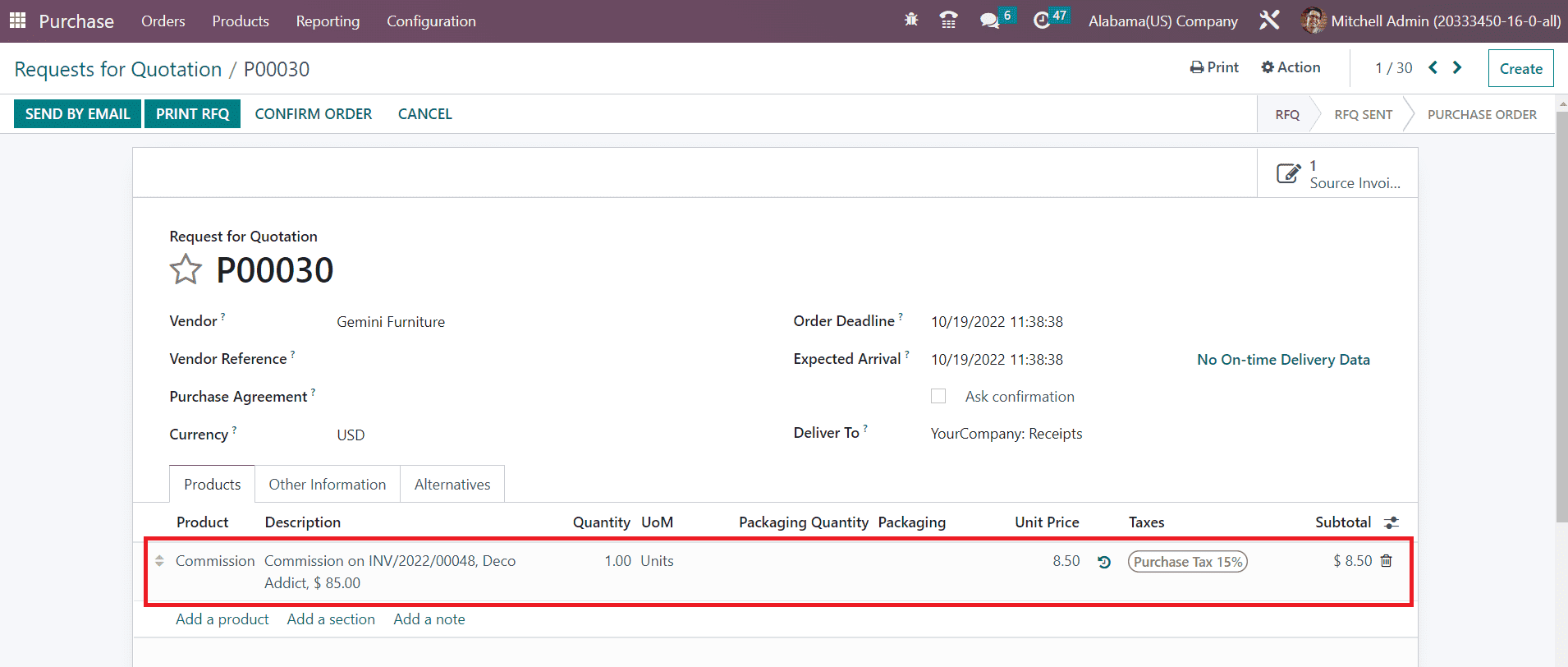 After the customer completes the payment, 10% of the invoiced amount will be transferred to the partner account. An RFQ will be generated in the Purchase module for your partner with the product Commission.