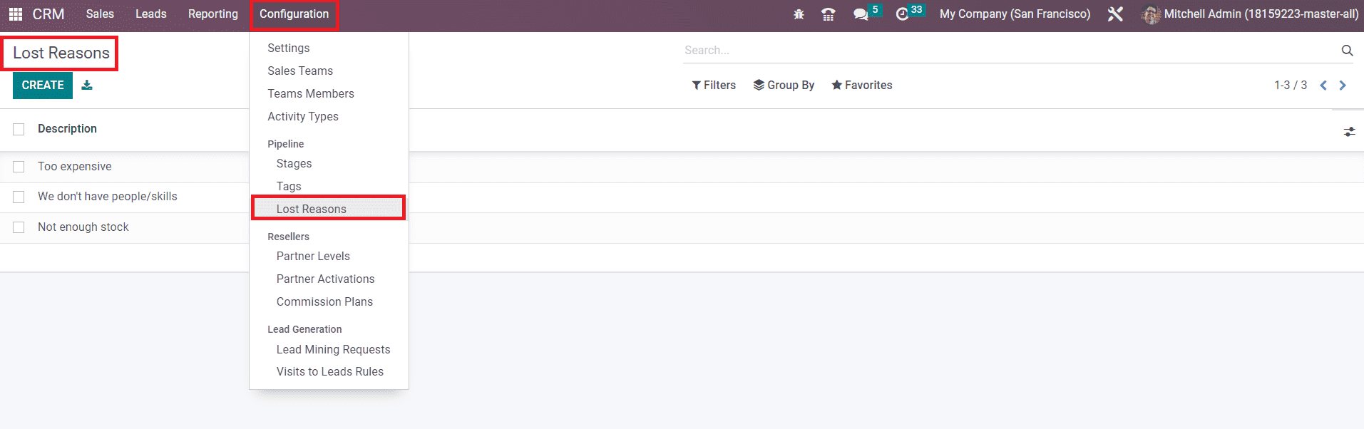 While working with leads/opportunities, you might lose some of them due to certain reasons. In Odoo CRM, it is possible to keep track of such leads/opportunities along with the reasons. Later, you can regain these lost opportunities with the assistance of Odoo. Under the Configuration menu of the CRM module, you will be able to get the Lost Reasons option which will give access to the platform to configure the reasons for losing leads/opportunities.