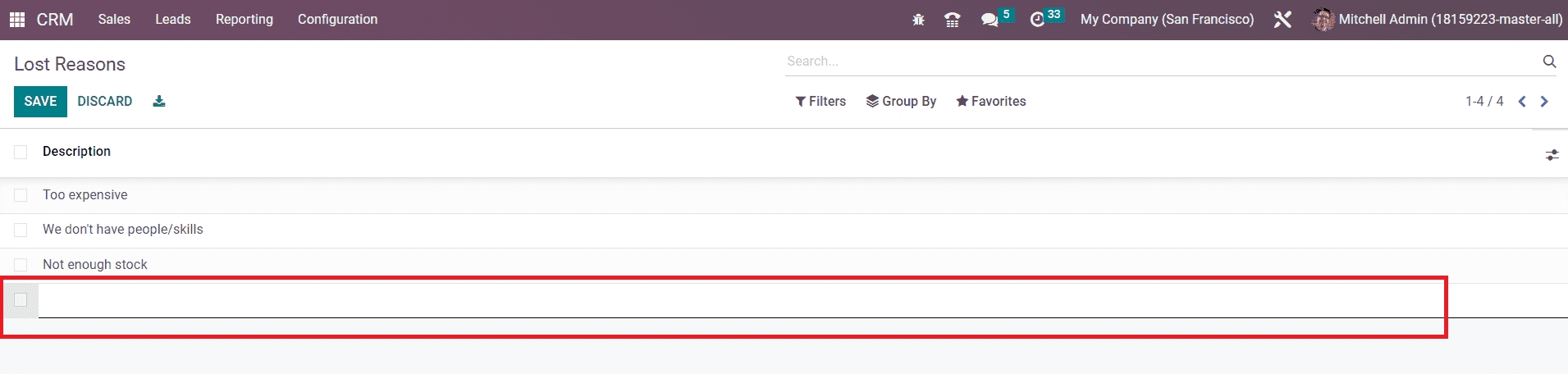 You can find some already configured Lost Reasons on this platform. Now, using the Create button, we can create a new lost reason. This can be done within a few clicks. As soon as you click on the Create button, a new line will appear under the existing line where you can simply mention the lost reason.