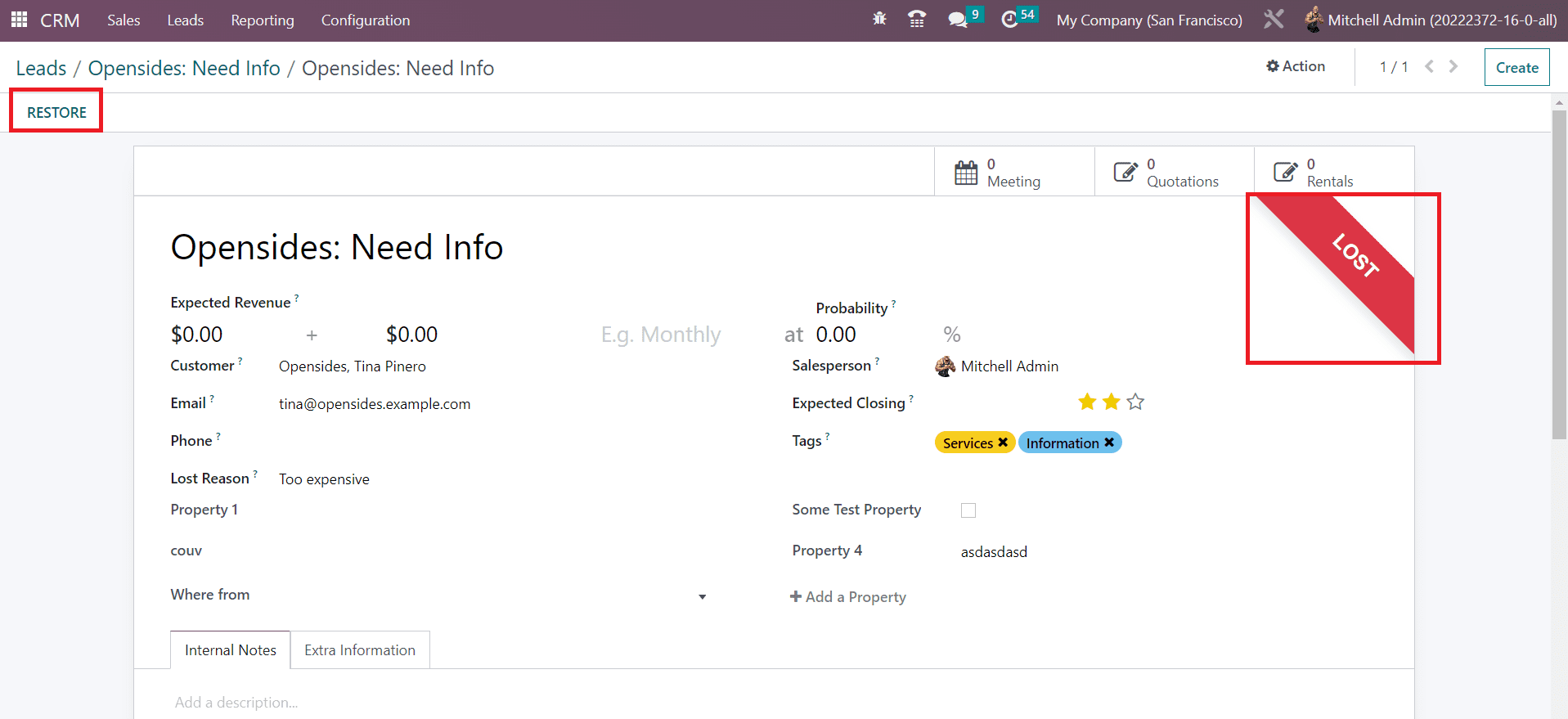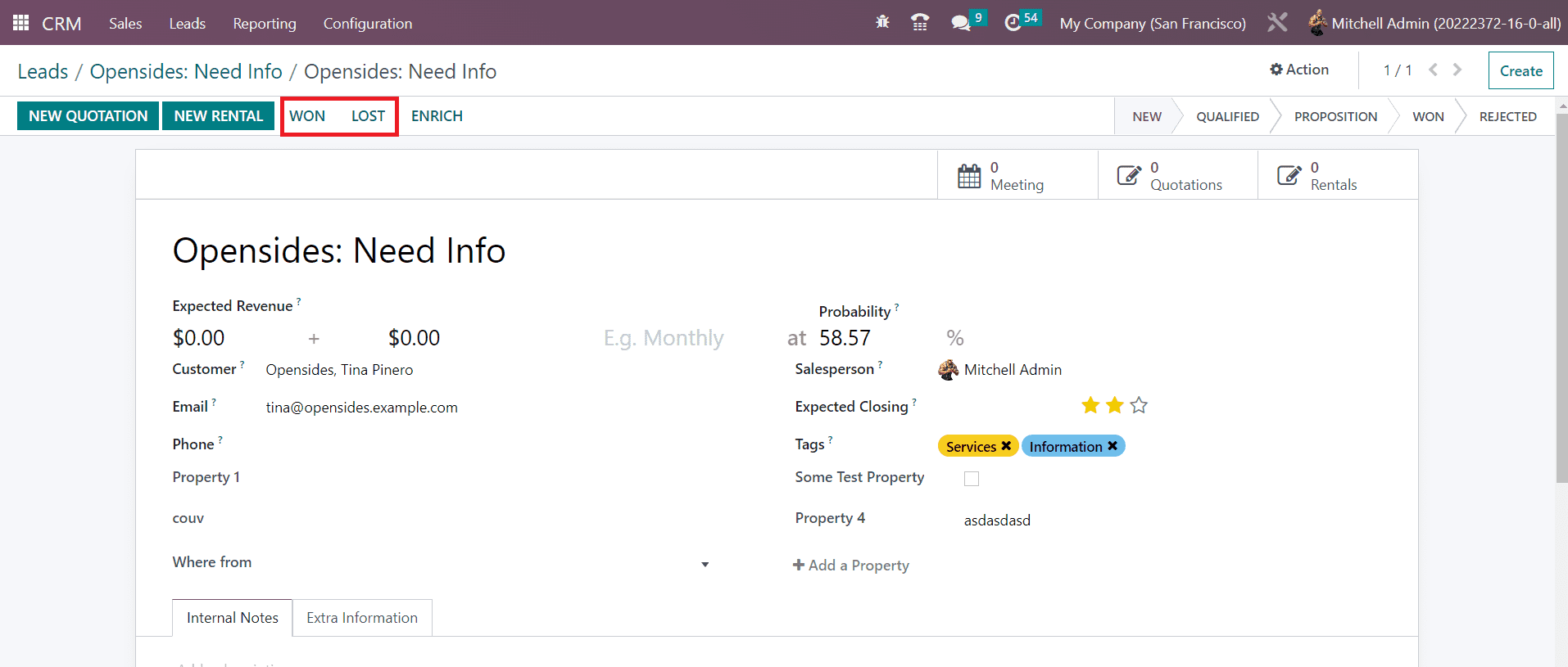 After submitting the lost reason, your opportunity will be marked as Lost as shown in the screenshot below.
