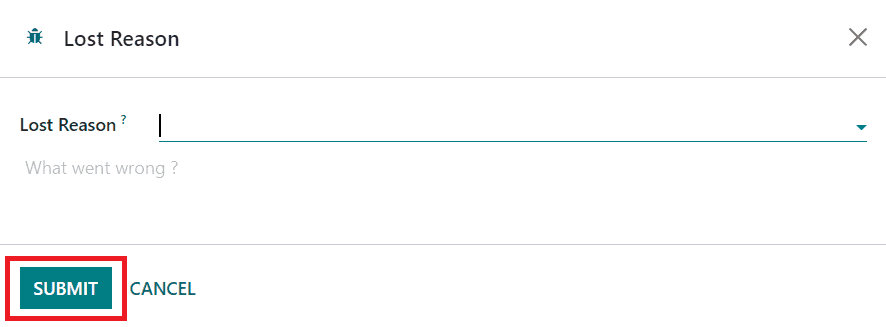 In the drop-down menu, you will get the list of lost reasons that we configured earlier. You can select a suitable reason from the given list and click on the Submit button.