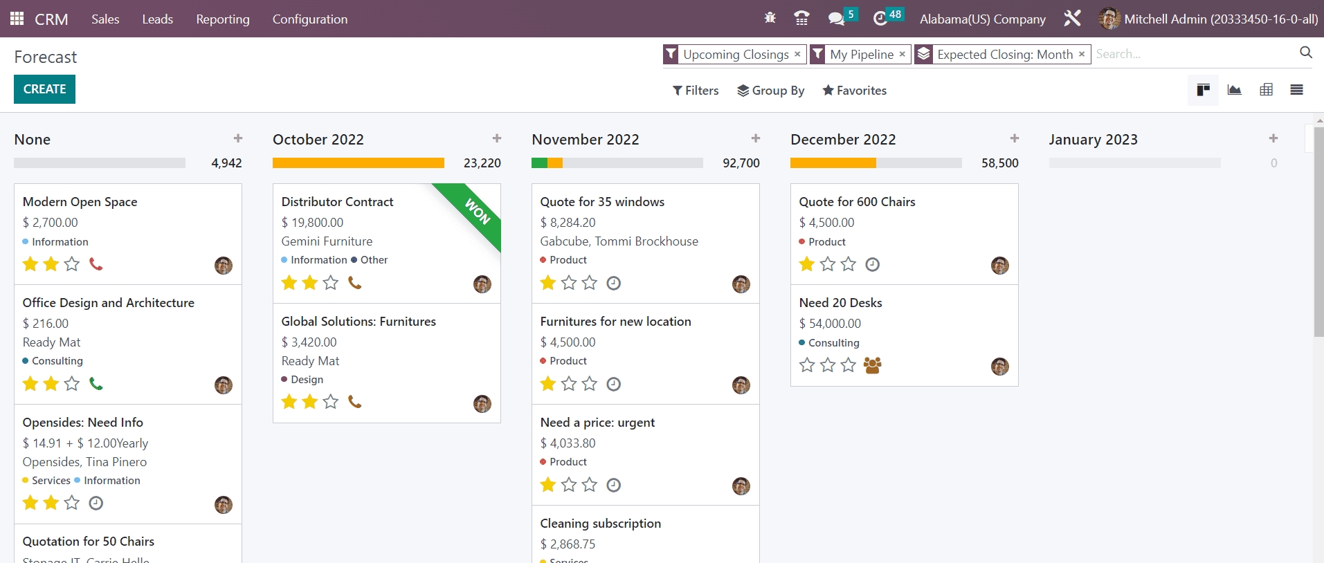 The Kanban view will provide the forecast report for each month separately. You can observe the prorated revenue of each month in this view.